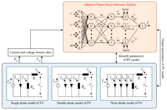 Parameter identification is highly important when the PV system is modeled and simulated but also in fault diagnosis. There are two types of models that can be used for parameter identification—the single diode model and the double diode model. The error metric employed for optimizing solar cell parameters is the root mean square error (RMSE) for both single and double diode models, compared to empirical I–V curves. In [34], the genetic algorithm approach is used to achieve parameter identification with a double diode solar cell model. The developed approach uses the diode voltages as a function of their temperature to estimate the currents and shunt resistance. The results identify the best individuals from the final generation that closely trace the experimental I–V curve with good convergence. Further, a flexible particle swarm optimization-based parameter identification for single and double diode solar cells is used in [35,36]. The fitness function used is the RMSE, which is dependent on the error function of the single and double diode model, as well as the solar panel. The proposed flexible particle swarm optimization algorithm (FPSO) algorithm produces lower RMSE than the others, and the I–V curves observed from the parameter identification follows the experimental curves under different irradiance and temperature values reasonably well. In [37], an artificial immune system is developed for solar PV panel parameter identification and modeling of the double diode model. The fitness function of the developed approach is based on minimizing the power–voltage curve at the maximum power point (MPP). The results identify that the proposed artificial immune system (AIS) method estimates parameters that are in agreement with the experimental values and compare the outputs with the genetic algorithm and particle swarm optimization. In [38], an artificial bee swarm optimization approach is developed for parameter identification of single and double diode models. The results show that, in terms of RMSE, the developed approach performs the best when compared with other methods developed in the literature. Similarly, in [39], the artificial bee colony is adapted for parameter identification of the single and double diode models of the solar cell. The developed algorithm converges faster and with higher accuracy (lower RMSE) than the other algorithms. Apart from the heuristic search approaches, the neural networks [40,41], and the adaptive neuro fuzzy inference system (ANFIS)-based parameter identification approaches [42] are also widely implemented in the literature. These approaches, when tested on solar panels with unknown parameters, have produced fairly good results. A general overview of implementing parametric identification with the ANFIS approach is shown in Figure 5. Further, a brief overview of various conventional and AI-based parameter identification techniques are compared to identify their accuracy as shown in Table 2.