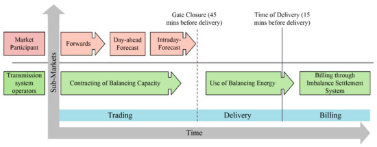 As an increase in grid-connected photovoltaic (PV) systems has been seen over the last few years, having accurate forecasts for the power production fed into the grid has become more of an important issue. The reason for an increase is primarily because of the reduction in investment costs, which decreased from 2019 to 2021, but also, factors such as incentives, regulations on technical requirements for building works, and other directives have played a role. As this increase is expected to continue for years ahead, the grid-connected PV systems will lead to higher changes in the electricity grid and can create instabilities, due to sudden changes in weather [53]. Further, the liberalization of the electricity markets has led to the introduction of spot markets for electricity, which played an important role in the balancing of supply and demand. Therefore, generators, retailers, large end customers and communities have to estimate their output and demand accurately. In order to do so, these market players have been using forecasting methods extensively. An overview on the energy market mechanisms and the resulting requirements for forecasts of electricity production by intermittent renewable energy sources is given in Figure 6.