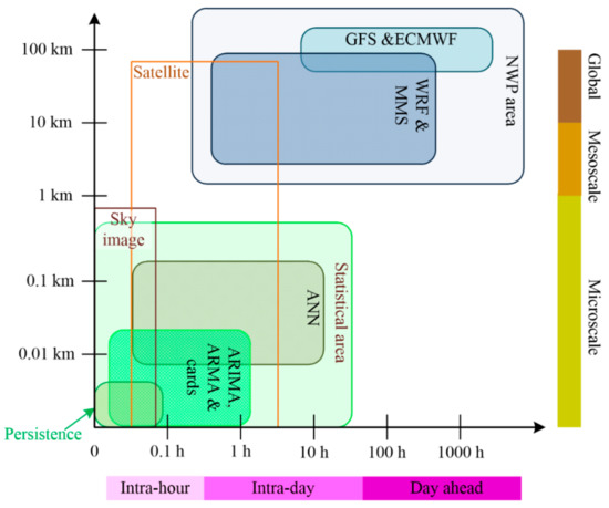 A review of solar irradiance forecasting using four different machine learning techniques (artificial neural network (ANN), support vector machine (SVM), k-nearest neighbor (k-NN), and deep learning (DL)) are presented in [61]. The comparison between the different techniques identified that ANN algorithm provided the best fitting for the data, followed by the DL, SVM, and k-NN techniques. A summary of the relation between different solar irradiance forecasting models, forecasting horizons, and the related activities with the grid operators are shown in Figure 7 [62,63]. Further, the DL techniques, and gradient boosted trees are used in [64] to forecast the solar irradiance directly from an extracted sub-image surrounding the sun. A detailed overview of different DL models for solar irradiance forecasting are discussed in [65,66,67,68,69]. In [66,68,69], a long short-term memory (LSTM) neural network technique is used to develop a multi-time scale model for solar irradiance forecasting. The developed approach achieved efficient resource sharing between multiple tasks with highly consistent performance, and improved metric results. Further, in [70], the wavelet decomposition-based convolution LSTM networks are used for developing the solar irradiance forecasting approach. The wavelet decomposition improves the operation of the network model by decomposing the raw solar irradiance into several subsequences. This enhances the forecasting ability and accuracy when compared to the conventional DL-based forecasting approaches. Similarly, in [67], the DL methodologies are adapted to develop time series models for solar irradiance forecasting in different areas. The developed models consider both single location and multilocation univariate data to achieve improved accuracy, performance, and reliability for both forecasting and the system operation. In [71,72], the ANN model is developed by customizing it based on the particular season of the year to provide an accurate forecasting approach. The developed approach is assisted with the Pearson correlation approach to provide the most suitable set of inputs for the ANN model. This improves the computational capacity of the model to furnish accurate predictions, even under strong irregularities and rapidly changing scenarios. Further, in [73,74], the solar irradiance forecasting is achieved by evaluating the potential of Gaussian process regression. This research opens a new avenue for the development of probabilistic renewable energy management systems to support energy trading platforms and help the smart grid operators with critical decision making during the inherent uncertainty of stochastic power systems. Apart from the deep learning and neural network approaches, the use of machine-learning classifiers, such as the multi-layer perceptron neural network [75], Naïve Bayes approach [76], and k-nearest neighbor neural network [77], and evolutionary algorithms, such as multigene genetic programming [75], are also widely adapted for solar irradiance forecasting. A brief comparison of the discussed literature on solar irradiance forecasting is provided in Table 4.