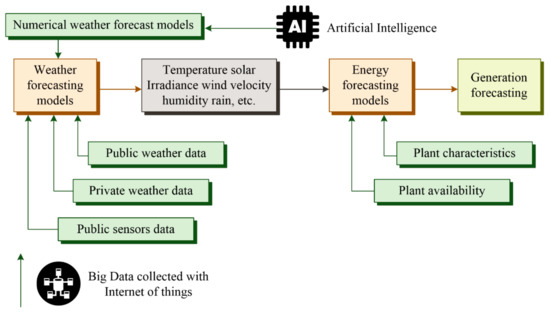 For grid operators to be able to handle sudden changes in power in the grid, accurate predictions of the output power from PV systems can contribute to reveal important information to regulate the electricity grid more efficiently. Variation in solar irradiance due to weather fluctuations causes variations in the power production from PV systems, and, as the use of large-scale grid-connected PV systems is increasing, it is important to strengthen the prediction of the PV system output power. Further, with the advantage of AI techniques to overcome the limitations of traditional methods and to solve complex problems that are difficult to model and analyze, they are viewed as a convenient method to forecast the solar radiation intensity and power output of PV systems [78]. The requirements for developing generation forecasting models with AI techniques are shown in Figure 8.