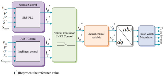 The ride through operation can be performed by using external devices (i.e., a flexible alternating current transmission system (FACT) device) or by modification of the controller of the inverter. The controller modification is an easy and much more economical method to achieve LVRT. In [116], a dual current controller is implemented, which controls the negative and positive sequence of the inverter under fault condition and injects reactive power into the grid as per the grid code regulation. In [117], a droop-based LVRT technique is discussed in which the variation in the DC link voltage is monitored and in the case of a drop, maximum power point tracking (MPPT) is switched to the ride through mode of the controller. Further, in [118], a coordinated reactive power injection control is proposed that utilizes the FACT device along with the inverter control for reactive power injection based on the priority assigned and injection requirement.