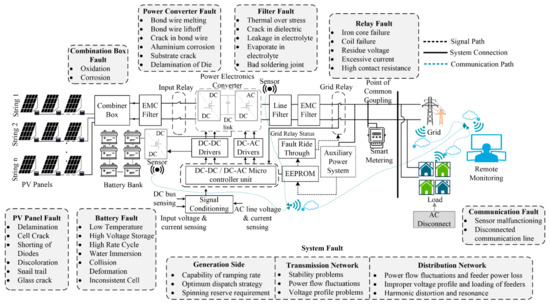 Grid-connected PV systems typically operate in rigorous and complex working conditions. They may suffer from various fault events, both at the component level or system level. The safety and reliability of grid-connected PV systems are of the utmost importance to ensure efficient operation of the system. Maintenance activities, including preventive maintenance, incorporating condition monitoring, fault diagnosis, remaining useful life (RUL) prediction, etc., are employed to improve reliability. Proper health monitoring at the component level and at the system level is required to ensure intended operation of the grid-connected PV system. It consists of firstly establishing the knowledge regarding the system behavior and dynamics based on the available information. Then, based on anomaly detection and parameter identification for the offline model dynamics, the knowledge gathered can be applied to real-time health monitoring or online monitoring (OLM) [137]. Detailed identification of various faults in the grid-connected PV systems are discussed in Figure 11 and Table 9.