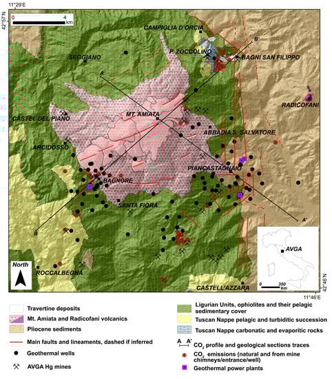 Geological sketch map of the Mt. Amiata volcanic–geothermal area (AVGA) area (modified from []).