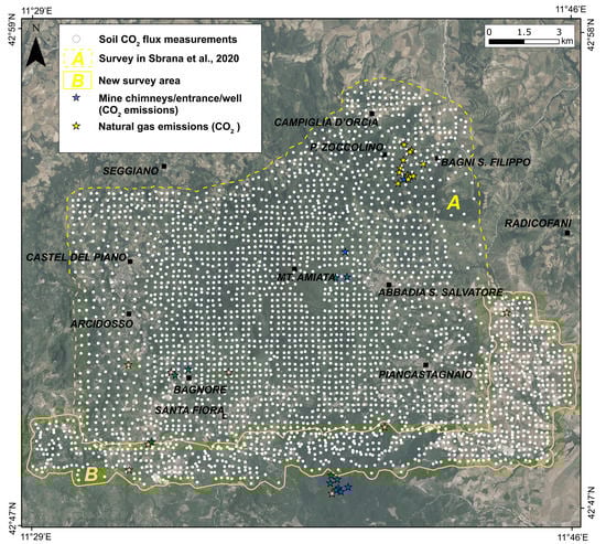 In the AVGA, high soil CO2 fluxes are found in correspondence with the infrastructures, tunnels, and mine shafts of Hg mines, where Quaternary faults and fractures are widespread, in correspondence with the Pietrineri, Bagnore, Mt. Labro, and Senna Morta mining areas (the latter is located between Piancastagnaio and Poggio Nibbio) (Figure 1).