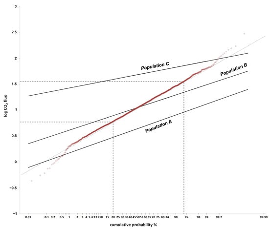 The dataset was analyzed through the GSA method, and data were plotted on the log-normal probability plot []. Even though the log-normal probability plot of soil CO2 flux data in the Mt. Amiata area (Figure 4) does not show a clear polymodal statistical distribution, the partitioning of the flux data was performed as described by Sinclair [] and Chiodini et al. []. Two inflection points were observed that identify three overlapping log-normal populations: i.e., population A (inflection point at 0.77 log10CO2, μmol m−2 s−1), population C (inflection point at 1.55 log10CO2, μmol m−2 s−1), and a third population (population B) made up of a mixture of populations A and C.