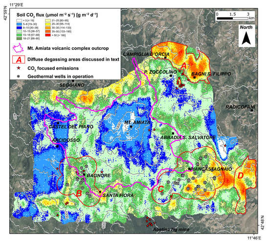 A recent soil CO2 flux survey [] identified a high diffuse natural soil CO2 flux in the AVGA area reaching 13,275 t/d in a surveyed area of 225 km2 consisting of 2482 measurement points with a density of 12 stations per km2. This is the widest and most detailed survey performed in the Italian geothermal areas. In the same paper, high and low soil flux areas were delimited and soil CO2 degassing was demonstrated to be inhomogeneous, reflecting the geologic structures and geothermal systems related to the volcano feeding system, magma chamber/intrusions, and regional fault systems. Four main high soil flux areas were identified, Bagnore, Piancastagnaio, Bagni San Filippo, and Seggiano. Low and very low soil flux areas were delimited as coinciding with the slopes of the volcanic massif and with the Arcidosso area (see Figure 6 in Sbrana et al. []).