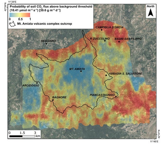 Using the background threshold (Table 2) as the cutoff value, the probability that soil CO2 flux exceeds this value highlights the diffuse degassing structures []. The probability map (Figure 6) emphasizes areas where the biological background prevails in addition to areas of diffuse anomalous degassing (deep carbon populations B and C), highlighting the strong soil CO2 diffuse degassing that affects the whole Mt. Amiata volcano geothermal area, with many areas showing anomalous fluxes.