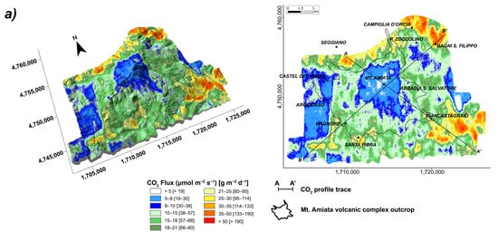Soil CO2 flux values in the Mt. Amiata area range from 0.43 up to 296.41 μmol m−2 s−1 (1.6–1127 g m−2 d−1) (Table 1 and Figure 3).