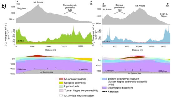 The soil flux profiles (Figure 7b) describe the degassing areas well. In profile AA’, the maximum gas flow rate occurs in the Piancastagnaio field, reflecting the presence of the relatively shallow and thick carbonatic–evaporitic reservoir. At the top of this reservoir, a CO2 vapor gas cap in the upflow zone of a robust convection system has developed. Furthermore, the K-horizon is relatively shallow at a depth of approximately 4.5 km. The K-horizon is the proxy of the granitic intrusion. In the thermometamorphic aureole of granites, CO2 is produced by thermometamorphic reactions feeding the geothermal reservoirs, and finally, the diffuse soil degassing is observed. In the same profile, an area of anomalous flux was observed in the Seggiano area.