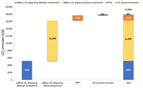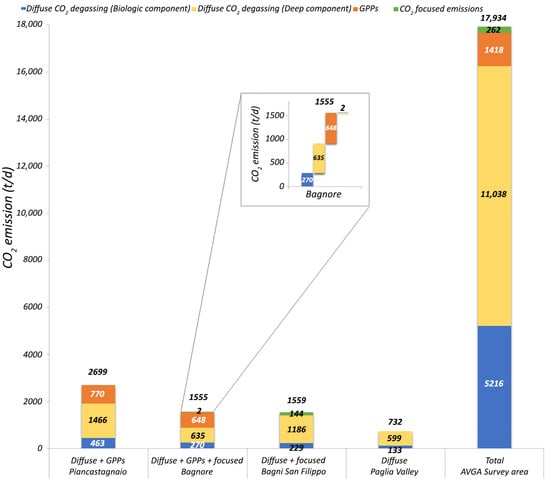 The different components comprising the CO2 budget for emissions in the AVGA are in the order of abundance: soil diffuse emissions, GPPs, and focused emissions (gas vents, thermal pools, and Hg mine infrastructures). All of the total collected data reported in Table 7 are visualized in the bar diagram shown in Figure 8, where the different single components and their sum are illustrated. The total soil CO2 flux is subdivided into the background flux values (calculated by means of data statistics) coinciding with the biological population A of Figure 4 and in the deep CO2 populations B and C of Figure 4 coinciding with the CO2 naturally formed in thermometamorphic aureole of the volcano magma chamber intrusion and rising from deeper magmatic mantle sources. The total CO2 emitted in the AVGA is estimated as 17,934 t/d (as shown by the right bar of Figure 8), of which diffuse deep CO2 is 11,038 t/d, where the 262 t/d of focused emissions must be added to this value. The total deep CO2 reaches 11,300 t/d. The CO2 emissions of the six GPPs of Bagnore and Piancastagnaio fields sum to 1418 t/d, which represents 7.9% of the CO2 emitted in the atmosphere in the AVGA.