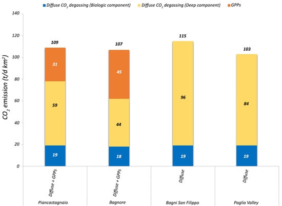 Another important focus concerns the analysis of the high CO2 flux areas. As previously stated, these areas coincide with the Bagnore (area B in Figure 5) and Piancastagnaio (area C in Figure 5) geothermal fields and with the greenfield areas unaffected by geothermal operations of Bagni San Filippo (area A in Figure 5) and Paglia (area D in Figure 5). Figure 9 shows the emissions in the different high soil flux areas expressed as t/d. Similar emissions are observed in different areas and separated into the background (biological), deep, GPPs’ emissions, and focused emissions. Because of the different areal extent of the high emission areas, a better way to analyze data is to normalize emissions for areas expressed as t/d km2.
