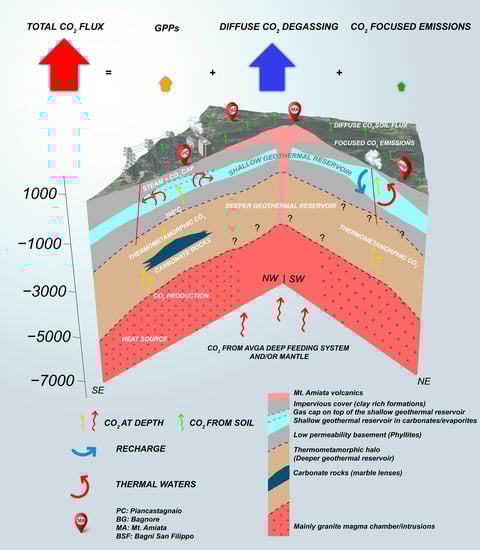 Our data suggest that from a statistical point of view, CO2 is mainly of deep origin with a contribution because of the biological activity of soils and plants. Deep CO2 derives by the contribution of the mantle, deep magmatic systems and by the thermometamorphic processes acting at shallow depths at the interface between granites and its wall rocks where thick layers of cornubianites form. The granite depth is revealed by the K-horizon reflector (the deep roots of the AVGA geothermal system). The CO2 from this source is preferentially transported upwards by the convective systems developed inside the water-dominated deep fractured geothermal reservoir hosted in thermometamorphic phyllites. From this geothermal deep reservoir, gases rise upward to feed the shallow geothermal reservoir hosted in porous fractured carbonatic–evaporitic rocks. The convection of the high temperature, aqueous fluids in reservoirs, and tectonic traps induce the formation of NCG (non-condensable gases) gas and vapor accumulations at the reservoir top because of the permeability contrast with the overlying clay-rich impermeable cover formation. The impermeable cover of geothermal systems stops rising up of the aqueous fluid, but it is not impermeable to gas, thus allowing the gas to rise to the surface and fueling the widespread CO2 diffuse emissions that characterize this area. In the presence of tectonic breaks (faults and fractures) in impermeable subsoil formations or the absence of impermeable formations at the top of geothermal reservoirs, concentrated gas emissions, i.e., gas vents, occur.