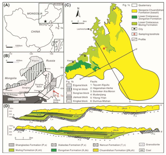 (A) Schematic map of NE China. (B) Simplified geological map of NE China, illustrating the location of the Laoheishan Basin. (C) Geological map of the Laoheishan Basin and the sampling well. (D) Cross profiles of the Laoheishan Basin [28].