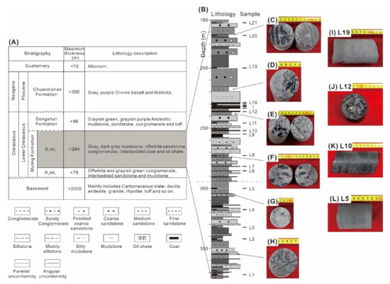 The Lower Cretaceous basin fill is dominated by the Muling Formation, with the thickness decreasing southeastwards (Figure 1D). The Muling Formation can be further divided into two members: the lower member (K1ml1) consists of conglomerate interbedded with sandstone and mudstone, and the upper member (K1ml2) mainly comprises sandstone, siltstone, mudstone, coal, and oil shale, with limited conglomerate (Figure 2A). Therefore, the K1ml2 was selected as the target interval for this study.