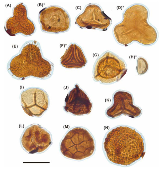- Balme, B.E. Fossil in situ spores and pollen grains: An annotated catalogue. Rev. Palaeobot. Palynol. 1995, 87, 81–323. [Google Scholar] [CrossRef]