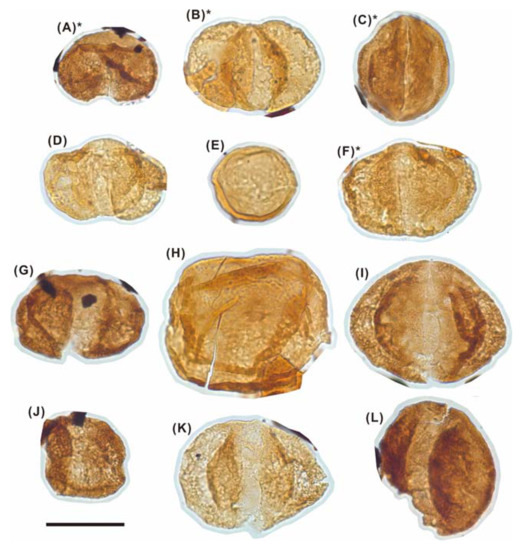 Photomicrographs of selected pollen in oil shale and coal. (A) Pinuspollenites sp. (B) Podocarpidites sp. (C) Protoconiferus sp. (D) Alisporites sp. (E) Araucariacutes sp. (F) Piceites sp. (G) Piceaepollenites sp. (H) Psophosphaera sp. (I) Protopinus sp. (J) Quadraeculina sp. (K) Pseudopicea sp. (L) Pristinuspollenites sp. The scale bar represents 50 μm. The photomicrographs marked with * are from [29].