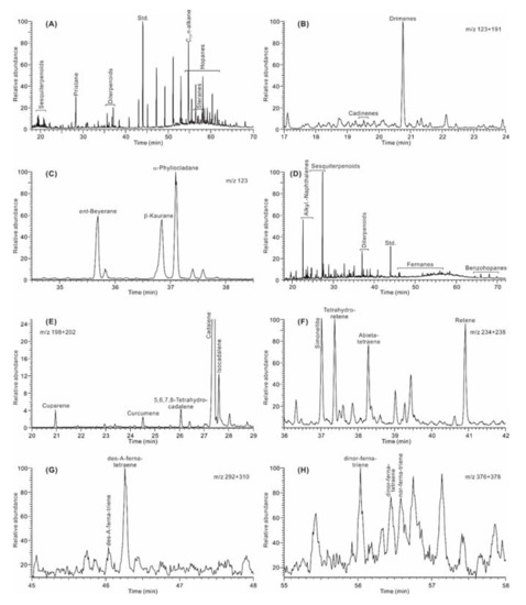 Gas chromatograms and mass chromatograms of a coal sample (L9). (A) Gas chromatogram of saturated hydrocarbon fraction. (B) Mass chromatogram of sesquiterpenoids (saturated hydrocarbon fraction; m/z 123 + 191). (C) Mass chromatogram of diterpenoids (saturated hydrocarbon fraction; m/z 123). (D) Gas chromatogram of aromatic hydrocarbon fraction. (E) Mass chromatogram of sesquiterpenoids (aromatic hydrocarbon fraction; m/z 198 + 202). (F) Mass chromatogram of diterpenoids (aromatic hydrocarbon fraction; m/z 234 + 238). (G) Mass chromatogram of fernanes (aromatic hydrocarbon fraction; m/z 292 + 310). (H) Mass chromatogram of fernanes (aromatic hydrocarbon fraction; m/z 376 + 378). Std., standard.