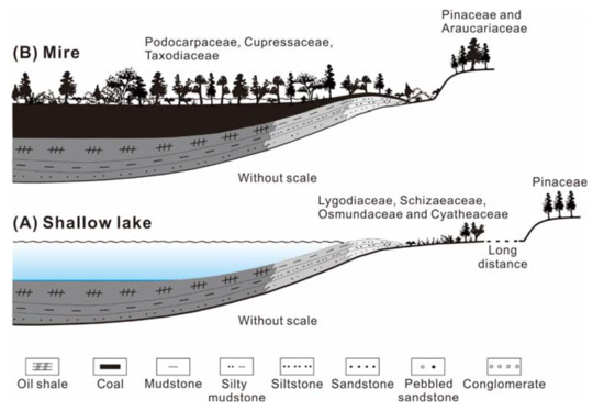 The paleoenvironment and paleovegetation during the formation of oil shale and coal in the Laoheishan Basin are illustrated in Figure 14. Oil shale was deposited in shallow lakes with freshwater, as indicated by low sulfur contents (avg. 0.12 wt. %; Figure 3C). Based on the results of palynology and terpenoid biomarkers, the paleovegetation during the formation of oil shale mainly comprised ferns (e.g., Cicatricosisporites, Osmundacidites, and Cyathidites) and sphenopsids (e.g., Concavissimisporites) on the lake shore, and the highlands in the adjacent regions of the study area hosted coniferous forest (mainly Pinaceae; Figure 14A). Ferns and sphenopsids living on the lake shore may have allowed a large number of spores to enter the lake (transported by surface water and/or wind-blown), and therefore be preserved in the oil shale [52]. In contrast, coal was formed in freshwater low-lying mire, as suggested by high ash yields (avg. 25.5 wt. %) and low sulfur contents (avg. 0.41 wt. %) [71]. The paleovegetation during the formation of coal was composed of highland vegetation and peat-forming coniferous plants, such as Pinaceae, Araucariaceae, Podocarpaceae, Cupressaceae, and Taxodiaceae, accompanied by sphenopsids (e.g., Concavissimisporites) and ferns (e.g., Cicatricosisporites; Figure 14B). Although pollen could be carried a long distance by wind, surface water, and/or insects, a large amount of pollen can still be “in situ” buried due to the flourishing of coniferous trees in the mire (e.g., Podocarpaceae, Cupressaceae, and Taxodiaceae) [72]. In addition, some kinds of coniferous trees, such as Podocarpaceae and Cupressaceae, could produce a large number of resins [73,74,75,76]. These resins would be transported into the lake or mire by surface water and/or wind, thus contributing to the formation of hydrogen-rich material (e.g., resinite) in oil shale and coal, and finally resulting in relatively high hydrocarbon generation potential. Because coniferous trees (including highland and peat-forming conifers) flourished in greater numbers in/near the mire than the lake shore (Figure 12), higher hydrocarbon generation potential was commonly present in the coal than in the oil shale. The results reveal the significance of terrestrial organic matter in the formation of excellent (coaly-) source rocks, which has been previously proven by the oil-source correlation results from Southeast Asia, Australia, and Northwest China [77,78].