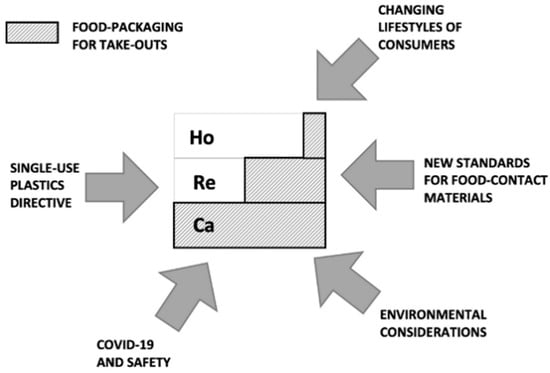 The challenges related to the pandemic have clashed with such global trends in the development of a circular economy, especially in the concept of digitalization, new organization of decentralized and remote work in sustainable growing cities, and green, environmentally friendly technology implemented in industries, etc. During the pandemic, changes in social behavior are observed, favoring solutions such as “from owning to sharing”, online shopping, etc. Within the HoReCa sector, new “pandemic” trends, e.g., increasing of ordering meals with home delivery, the use of single-use packaging on a large scale, and request for sanitary and hygienic safety, have been observed []. Within the sector of single-use packaging for food production, the trends of the circular economy are seen in the following dimensions: