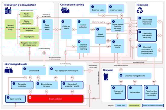 According to the last report of the Ellen MacArthur Foundation, a comprehensive circular economy approach has the potential to reduce the annual volume of plastics entering our oceans by over 80%, generate savings of USD 200 billion per year, providing a 25% reduction of greenhouse gas emissions as well as over 700,000 net jobs by 2040 []. However, to achieve this remains challenging, taking into consideration the complexity of the plastic flows in the economy, as depicted in Figure 3.