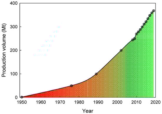 It is even more complex bearing in mind that, in 2019, the production of plastics worldwide was approximately 368 million tons, as depicted in Figure 4, and the incredible flexibility, versatility, and usefulness of this group of materials result in a steady increase in production from year to year [].
