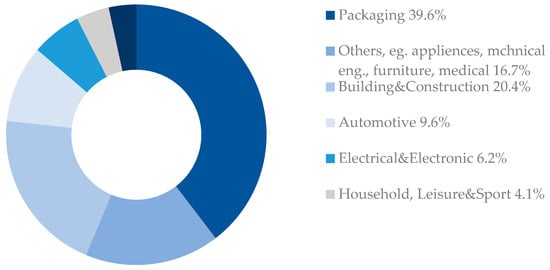 In 2019, the European plastics industry had a turnover of more than 350 billion euros []. Along with the increase in production, the market value of plastics is also growing steadily, especially given that they are used in many different products among which the largest end-user of plastics is the packaging industry, as shown in Figure 4 and Figure 5.