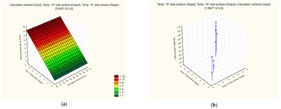 The simulation was made with the help of artificial neural networks, which allowed the prediction of the surface temperature in relation to the “dew point”, temperatures corresponding to the relative humidity of indoor air, on the basis of the research results (the results presented above were extended and the prediction database was built). For the case under consideration (temperature prediction), the problem is defined as an attempt to develop a phenomenological model, determining the relationship between warming and temperature—which is a very complex issue. Neural networks are used when the derivation of the model is impossible. Complicated derived dependencies are insufficiently accurate. Then it is advantageous to use neural networks. The obtained solution will be accurate because the data in the learning set will be the real values of research. As stated above, the neural network follows the pattern given during learning. In the analysed case, the patterns are the results of temperature tests. The data subjected to analysis were divided into sets: