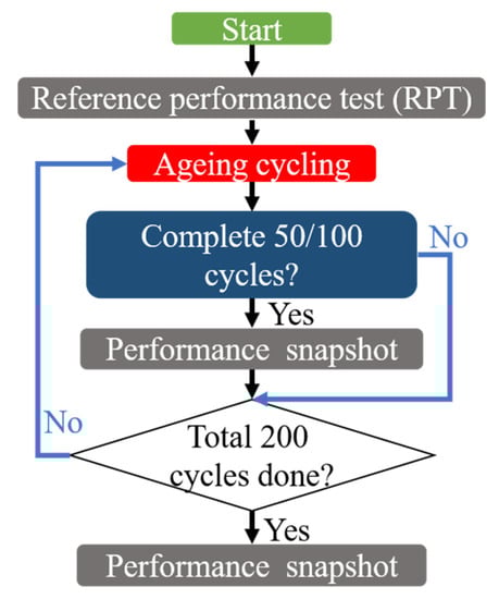 Nickel tabs (22 mm × 8 mm × 0.15 mm) were welded to the battery electrical terminals using an MTI spot welder. Low resistant brass blocks were bolted at constant torque to clear acrylic sheets with positioning holes. Figure 1. shows the flowchart of experimental procedures, which mainly include snapshot tests and ageing cycling tests, along with logical criteria of continuing or stopping tests.