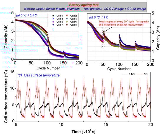 It is expected for cells tested at high current rates to experience more severe lithium plating; thus, a larger capacity drop should be observed. However, the opposite phenomenon has been observed in this study. After 200 cycles of tests at 0 °C, the average capacities of cells tested at 0.5 C and 1 C dropped from 4250 mAh to 250 mAh and 1250 mAh, respectively. The most likely reason is that even though the thermal chamber temperature was the same at 0 °C for both 0.5 C and 1 C cycling tests, the self-heating in the resulting battery temperature differs. Cells undergoing 1 C ageing tests had an approximately 10 °C higher surface temperature than that undergoing 0.5 C ageing tests, which was shown in Figure 2c. Waldmann et al. investigated the temperature-dependent ageing mechanisms in 18,650 cylindrical NMC111 cells [13]. Cells were aged in the temperature range of −20 °C to 70 °C. They found that below 25 °C, the ageing rates increase with decreasing temperature, while above 25 °C, the ageing is accelerated with increasing temperature. This finding from Waldmann et al. matches well with that from this study that a higher cell temperature cycled in 0 °C leads to slower battery degradation. A subsequent study with internal thermally instrumented cells is planned to further investigate this phenomenon.