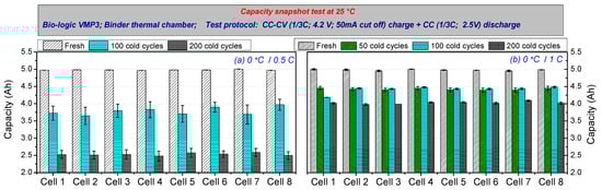 Capacity snapshot tested at 25 °C and 1/3 C for batteries that experienced a 0 °C cold cycling under the current rates (a) 0.5 C; (b) 1 C.