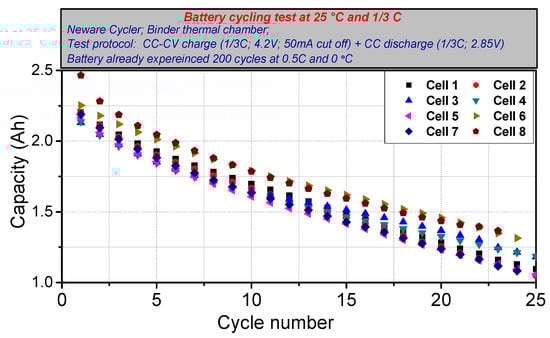 For each capacity snapshot, five repeats were conducted. Error bars were calculated from the standard deviation of results from five repeats. Figure 3a clearly showed a much larger error than those in Figure 3b. Indeed, a noticeable drop of capacity in five repeats for cells that experienced 0.5 C cold cycling is surprising, considering that the capacity snapshot is done under a mild condition (1/3 C and 25 °C). It is hypothesized that the cells suffer from permanent internal damage to the electrodes. To further confirm this, at the end of the 200 cycles of 0.5 C cold ageing, the cells were tested at 1/3 C and 25 °C (same as capacity snapshot tests) for 25 cycles, the results of which are presented in Figure 4. The battery capacity shows a significant continuous drop, present in all cells with some level of variation. After 25 cycles at 1/3 C and 25 °C, batteries were stored for three months. At the end of the three-month storage, the cell terminal voltage dropped to 0 V. Klein et al. [29] studied the degradation mechanism of NCM523, and in aged cells, they observed remarkable fluctuations of the charge capacity as well as the cell voltage and current noise. They mentioned that severe dendrite formation and penetration through the SPE is most likely the main source for “voltage noise” and sudden cell failure. They called this failure mode a lithium dendrite micro short circuit. The micro short circuit, in the worst case, even causes a rollover failure. It is hypothesized that a micro short circuit due to cell lithium dendrites might result in the accelerated battery degradation presented in Figure 4. Further studies are needed to examine this assumption.