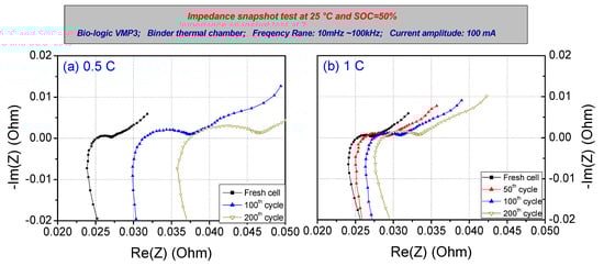 The primary effect of degradation on the cell’s kinetics is an increase in internal resistance or cell impedance. An increase in resistance can also lead to a decrease in useful energy capacities since the lower voltage cut-off of the cell is reached sooner in a cell with higher internal resistance. Equivalently, the higher voltage cut-off is reached sooner during charging. Figure 6a,b shows Nyquist plots of batteries EIS (SOC = 50%) cycled at 0.5 C and 1 C, respectively. Results of other SOCs are shown in the Appendix A (Figure A3).