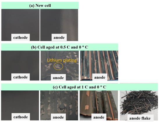 Electrode images from new and cold aged cells are shown in Figure 7. There is no visual difference observed in the cathodes for either new or aged cells. However, lithium plating on anodes (white stain) was observed for cold aged cells, which are signs of lithium plating resulting from cold cycling. Waldmann et al. investigated NMC111 pouch cells with reference electrodes, and they observed that in the anode, there is a negative polarization with respect to Li/Li+ at the temperature range of −10 to 20 °C [13]. However, at a temperature higher than 25 °C, there is a positive polarization in the anode with respect to Li/Li+. They also opened cells and found that the anodes were plated with grey metallic Li. Lin et al. also reported the negative anode potential during charging at −20 °C [32].