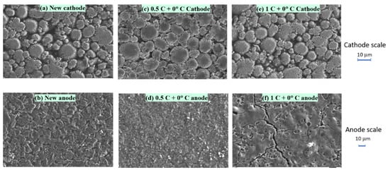 Figure 8 shows SEM images taken from new and cold aged cells. There is not much change in cold aged cathodes compared to the new ones, except for some cracked particles in the 0.5 C cycled cell at 0 °C (Figure 8c). The new anode (Figure 8b) shows the continuous structure, whereas both 0.5 C and 1 C cold cycled anodes show distinct cracks. More SEM and EDX spectroscopy results are available in the Appendix A (Figure A4, Figure A5 and Figure A6). It should be noted that the images shown in Figure 8 were taken by a ZEISS FE-Sigma 500 at Coventry University, and those in Figure A4, Figure A5 and Figure A6 were taken by a ZEISS Ultra 55 at Coventry University.