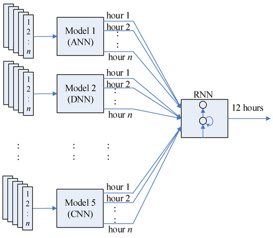 The forecasting results of single learners are fed to the RNN meta-learner as the training and testing dataset. In RNN, n is 144 h (12 h × 12 days) in the training stage and 12 h in the testing stage. As illustrated in Figure 1, the output results of every single learner model have one vector as the input to the ensemble learner. In our case, we have five single learner models, and the RNN input is a matrix of 5 by n. The output of the RNN meta-learner is the final ensemble forecasting results of 12 h for one-day ahead PV power forecasting.