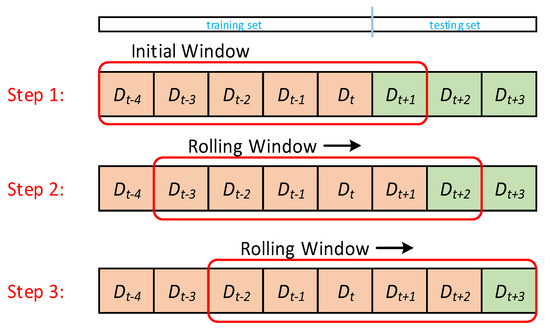 To perform the three-day ahead PV power forecasting, the one-day ahead PV power forecasting is implemented and followed by the rolling-window technique as shown in Figure 2. For example, in step 1, we use the five-day training datasets as input to predict the next day’s PV power output Dt+1. In step 2, the five-day training datasets, including the prediction results obtained in step 1 (i.e., Dt+1), are employed as input to predict Dt+2. The third step employs the five-day training datasets, including the previous two-day predictions in steps 1 and 2, as input to predict Dt+3. The three-day ahead rolling window technique is performed per day to increase the accuracy of PV power forecasting. The forecasting horizon used in this study is 1–3 days ahead with hourly resolution.