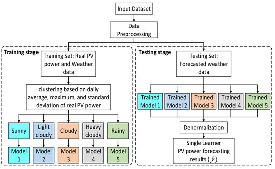 The training and testing stages are shown in Figure 3. Before preparing the training and testing data sets, the overall input data are classified into five different weather types using the fuzzy c-means (FCM) method based on the Calinski-Harabasz (CH) index. This treatment is performed to obtain better forecasting performance. Then, the classified weather data sets are sunny (61 days), light-cloudy (101 days), cloudy (96 days), heavy-cloudy (62 days), and rainy (25 days).