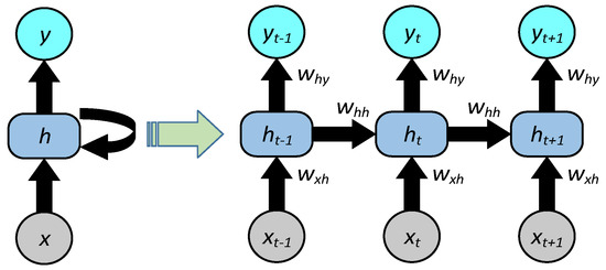 RNN is a type of dynamic neural network in which the output depends on the current input to the network, and previous inputs, outputs, and hidden states of the network [46]. RNN contains hidden states that are distributed across time. This structure allows RNN to efficiently store a vast quantity of information about the past. The core idea is that recurrent connections allow the memory of previous inputs to persist in the network’s internal state and thereby influence the network output.