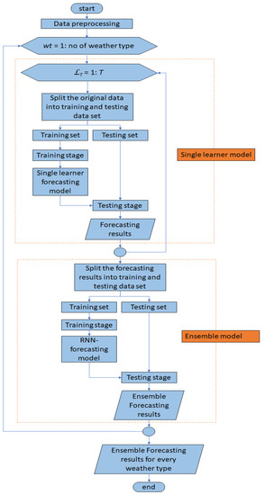 The proposed ensemble forecasting algorithm for PV power generation consists of the data preprocessing, five single algorithms, and meta-learner algorithm. Figure 1 shows the RNN-based ensemble method. The input of the single learner algorithms is the hourly historical PV power output and weather variables such as air temperature, relative humidity, and average wind speed with a duration of 12 h in one day from 06:00–17:00. n is the length of training or testing dataset of the single learner for each of the five weather types, for example, for sunny weather type, the training dataset (n) is 576 h (12 h × 48 days) in the training stage, and the testing dataset (n) is 156 h (12 h × 13 days) in the testing stage.
