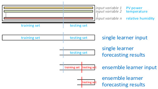 Figure 6 shows the detailed process of the proposed ensemble forecasting algorithm. We take three-day ahead ensemble forecasting as an example to describe the detailed process. The input variables for the five single learners are preprocessed first. For each weather type, the original data set is split into training and testing sets to build up and test the single learners, respectively, i.e., ANN, DNN, SVR, LSTM, and CNN. The forecasting results of all the single learners are accounted as the ensemble input variables. The ensemble input variables are also split into training and testing sets for each weather type. The corresponding numbers of days for different weather types are shown in Table 2.