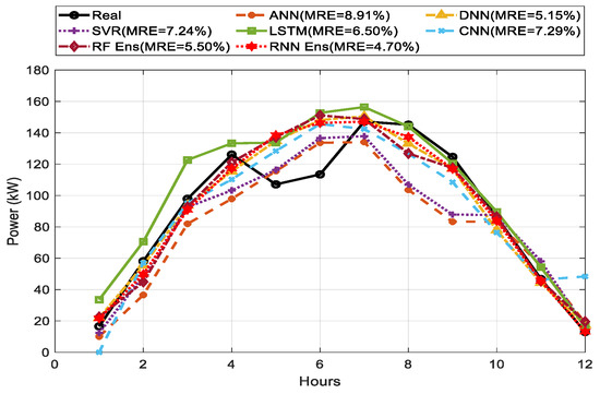 LSTM and CNN showed the lowest performance. The MREs were 4.99%, 2.56%, and 7.26% for DNN on sunny, cloudy, and rainy days, respectively. DNN performed better than any single methods and ensemble methods with an MRE of 4.99% on sunny days. However, the RNN ensemble, as our proposed method, showed a consistent performance with the lowest MRE of 2.53% and 4.77% on cloudy and rainy days, respectively.