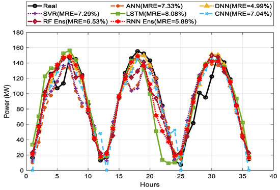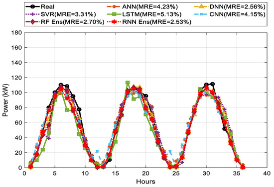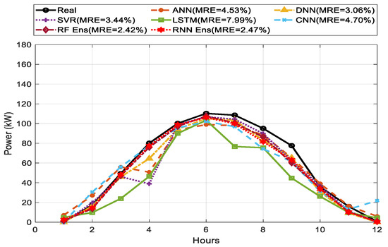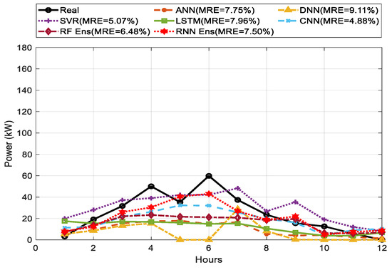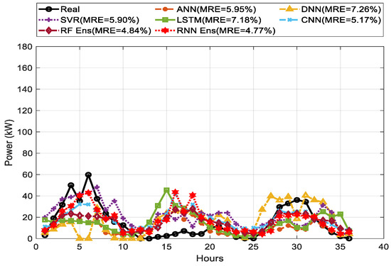 Table 6 shows the performance of the single and proposed ensemble method in one-day ahead forecasting with different error validations. As observed, the performance of our proposed method compares to the RF ensemble method on one-day ahead PV power forecasting. The weighted average MRE of the proposed RNN-ensemble method and the RF method were 3.87% and 4.53%, respectively. The proposed ensemble method is better, especially if the number of data points is low. RF only has a good prediction on cloudy days because RF can perform better on a higher number of data points for one-day ahead PV power forecasting. Overall, the superiority of our proposed method is prominent.