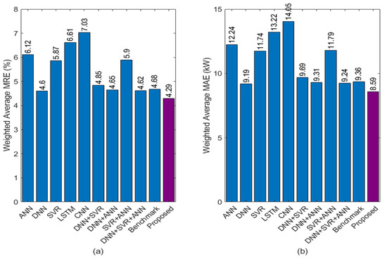 Figure 15 shows the comparison among the single methods with corresponding combinations of the best three, benchmark, and proposed methods in terms of the weighted average MRE and MAE. The combinations of the best three methods of DNN, SVR, and ANN are superior to any single method. The RNN-ensemble of DNN+SVR+ANN has slightly better accuracy than the benchmark method. The proposed method is proved that the RNN-ensemble of the five single learner methods is superior compared to the combinations of the best three single learner methods with MRE of 4.29% and MAE of 8.59 kW for a 200 kWp PV farm.