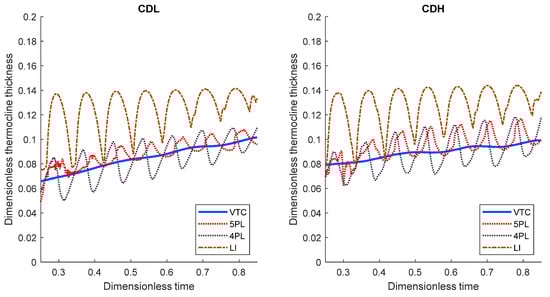 Dimensionless thermocline thickness evolution determined by Virtual TC (VTC), five parameter logistic function (5PL), four-parameter logistic function (4PL) and linear interpolation (LI) during the thermal charge process through the CD inlet at low flow rate (CDL, left side) and high flow rate (CDH, right side).