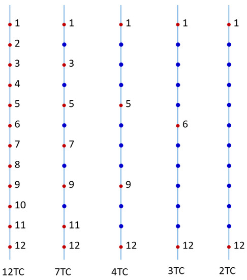 Number and position of the thermocouples used in the 5 models performed for each experimental test to evaluate the sensitivity of the VTC method to the number of TC used. The red circles represent the TC used, and the blue circles represent the positions at which the temperature prediction was made in each model.