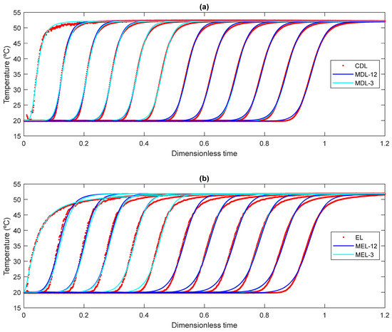 Figure 3 shows the temperature profile evolution at each TC location, estimated from the experimental data with the CD inlet (Figure 3a) and with the Elbow inlet (Figure 3b), both at a low flow rate. In addition to experimental data (CDL and EL), the corresponding models performed with 12 TC (MDL-12 and MEL-12) and 3 TC (MDL-3 and MEL-3) are also depicted. As can be seen in Figure 3a,b, the temperature at the location of each real TC during charging showed a similar trend in both the experimental tests and with the methods performed with 12 and 3 real TC. A good correspondence between the experimental and estimated temperature values was found. The results obtained with the CD at a high flow rate showed a similar pattern. However, it was not the case with the E inlet at a high flow rate.