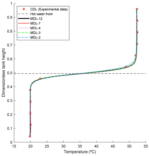 The temperature profile obtained with all the MEL, MDL and MDH models was well defined and showed great agreement with that obtained from experimental data, regardless of the number of TC used for its determination. Figure 4 shows the instantaneous temperature profile at t* = 0.5058 (50.58% of the total tank volume replaced) obtained with the experimental data in the CDL test and the five MDL models.
