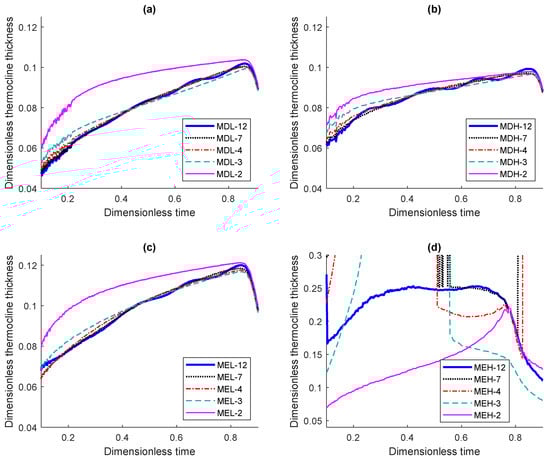 Evolution of the thermocline thickness at the points where the thermocouples were located. Estimation with MDL (a), MDH (b), MEL (c) and MEH (d) models.