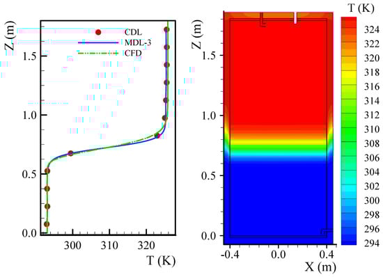 The instantaneous temperature profile at t* = 0.5734 (57.34% of the total tank volume replaced) was obtained for CD at a low flow rate with the MDL-3 model, with the CFD model previously developed and validated, and with the experimental data (CDL), are shown on the left-hand side of Figure 6. The right-hand side shows the temperature distribution also at t* = 0.5734, and for CD at a low flow rate, obtained with the CFD approach, the temperature contours being presented in the symmetrical XZ-plane.