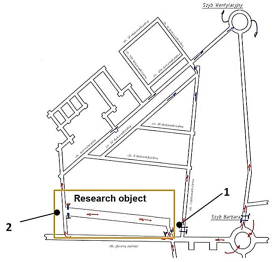 Location of the excavation in the ventilation network of the Experimental Mine Barbara: 1—dam T2, 2—dam T3.